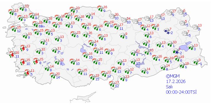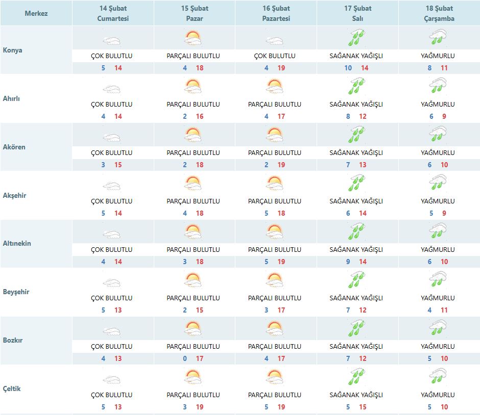 Meteoroloji yetkililerinin son tahminlerine göre, Konya'nın tamamında 17 Şubat Salı ve 18 Şubat Çarşamba günleri gök gürültülü sağanak yağış etkili olacak. Hafta boyunca 2-19 derece arasında seyreden hava sıcaklıkları, yağışla birlikte ani bir düşüş yaşayacak.