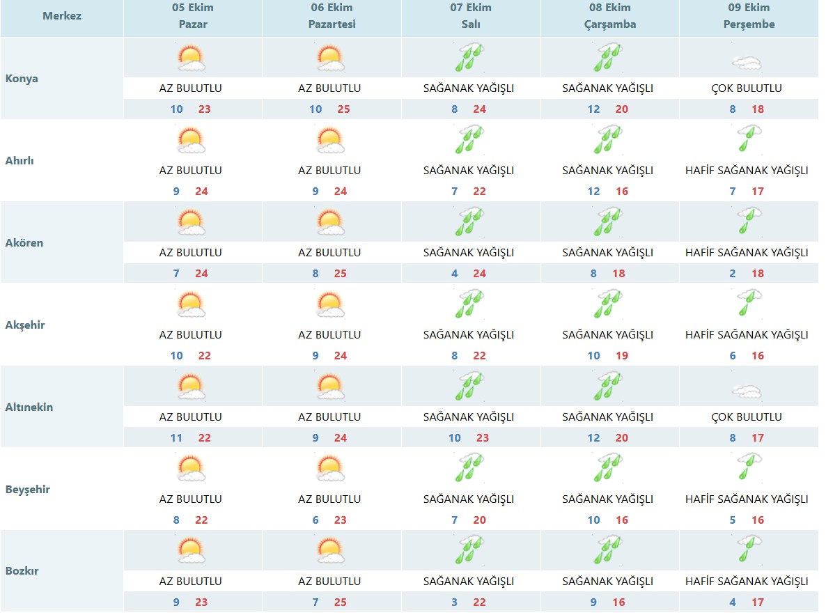 Konya'nın 31 ilçesinde 7 Ekim Salı ve 8 Ekim Çarşamba günleri Konya genelinde sağanak yağış bekleniyor. Meteoroloji yetkilileri, vatandaşları ani sel, yıldırım ve rüzgâr gibi olumsuzluklara karşı uyardı.
