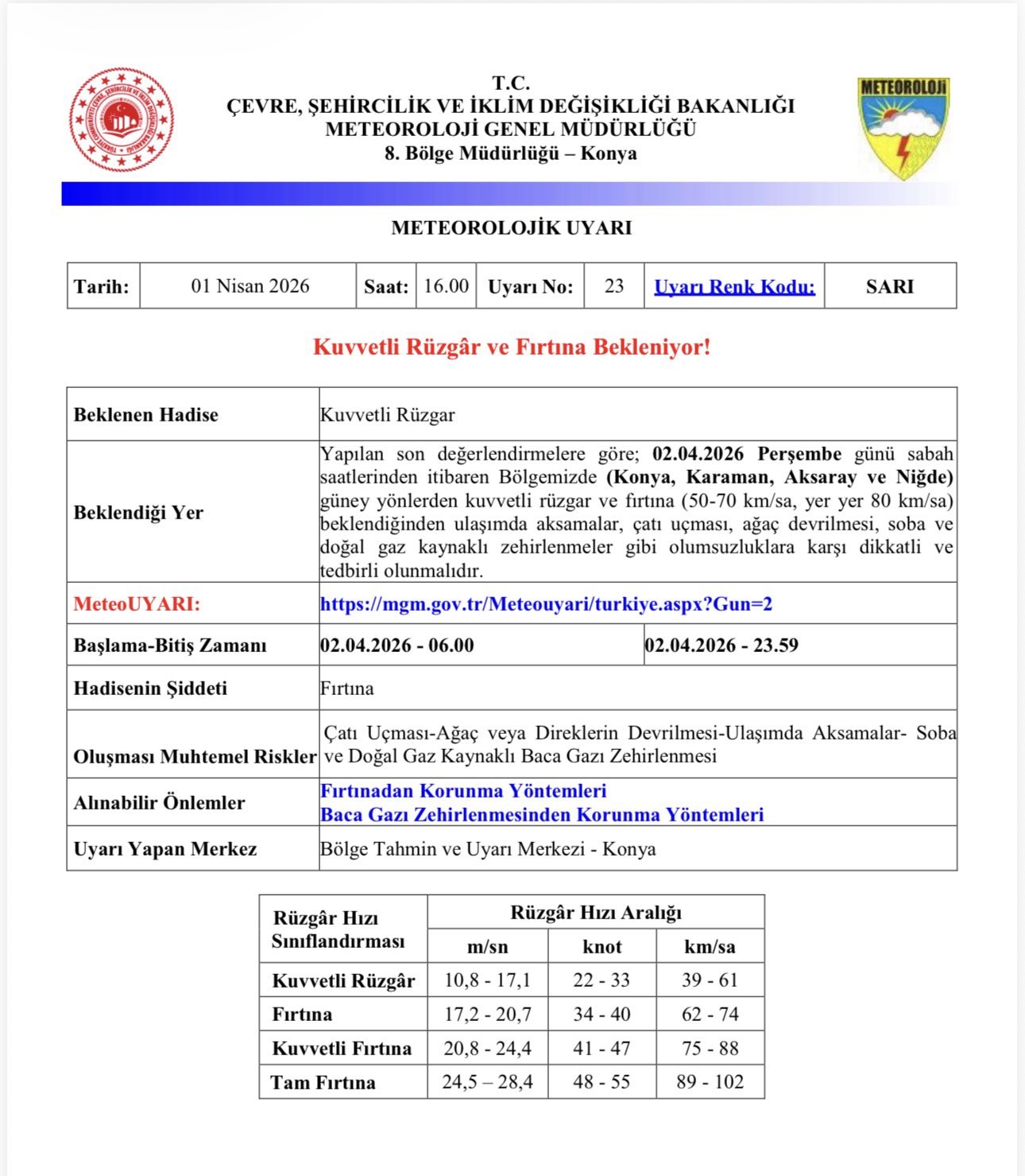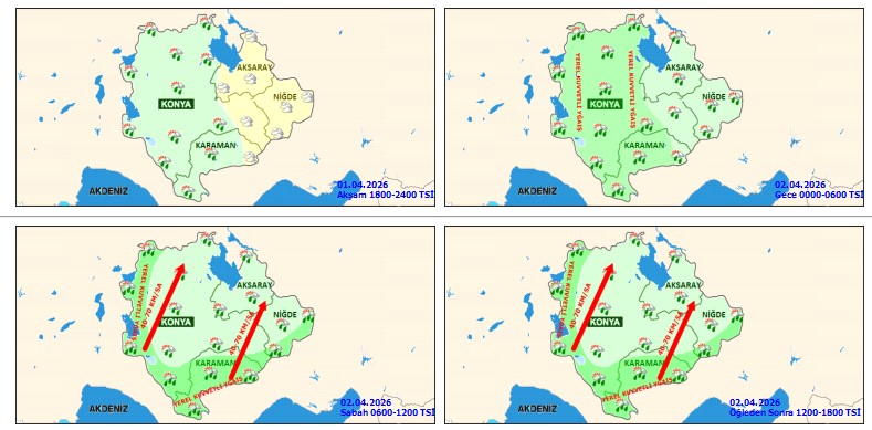 Yapılan açıklamaya göre, 2 Nisan 2026 Perşembe (yarın) günü sabah saatlerinden itibaren Konya ile birlikte Karaman, Aksaray ve Niğde çevrelerinde güney yönlerden kuvvetli rüzgâr ve fırtına bekleniyor. Rüzgâr hızının saatte 50-70 kilometre, yer yer ise 80 kilometreye kadar ulaşabileceği tahmin ediliyor.
