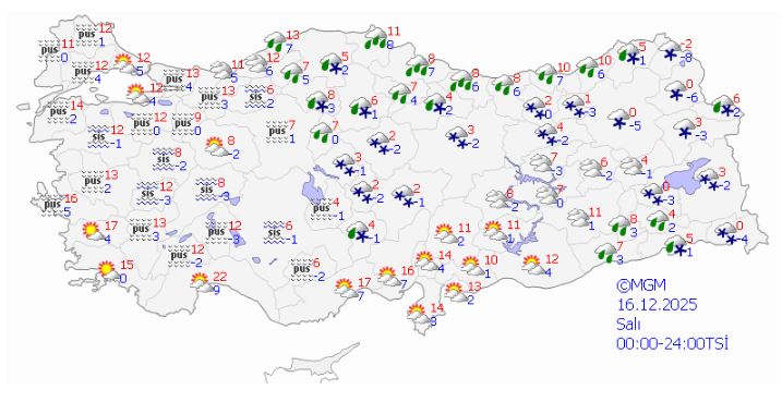 Meteorolojinin son hava tahmin raporuna göre hava sıcaklığının en yüksek 6 derece olması beklenen Konya'da havanın bugün (16 Aralık Salı) parçalı ve çok bulutlu, öğle saatlerinden sonra ise Halkapınar ve Ereğli ilçelerinde karla karışık yağmur bekleniyor. Diğer ilçelerde ise sisli hava etkili olacak. Vatandaşların ani sıcaklık düşüşüne karşı dikkatli olması uyarısında bulunuldu.