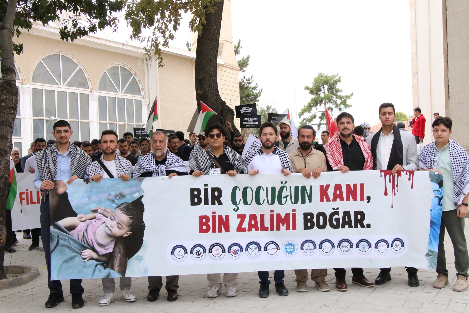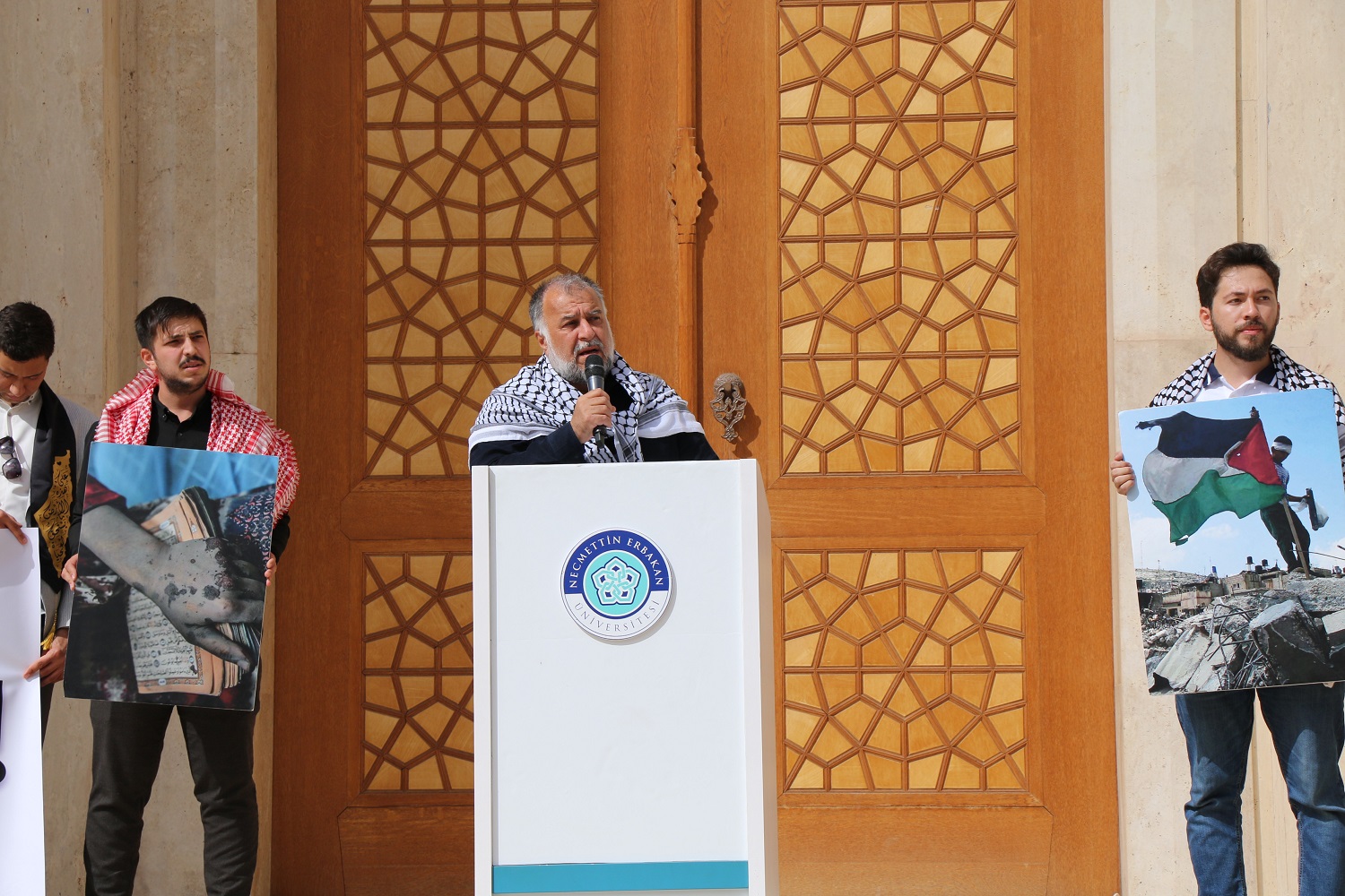 Konuşmasına, "Bugün burada sadece bir coğrafyadan, bir şehirden bahsetmiyoruz. Gazze dediğimizde; sabrı, direnişi, zulme karşı onurlu bir duruşu, açlığa, yoksulluğa ve kuşatmaya rağmen dimdik ayakta kalan bir halkı anıyoruz” sözleri ile başlayan Prof. Dr. Kamil Güneş, "Gazze, sadece Filistin halkının değil, ümmetin kalbidir. Gazze, insanlığın vicdanıdır. Orada çocuklar en temel haklardan mahrum büyüyor. Bir bardak suya, bir lokma ekmeğe, bir damla ilaca muhtaç bırakılıyor. Bombaların gölgesinde oynayan çocukların gözleri, "Biz hangi günahın bedelini ödüyoruz?” diye hesap soruyor. Gazze'de yıkılan evler sadece taş duvarlar değildir; bir milletin yüzyıllık hayalleri, duaları, umutlarıdır. Ama ne var ki, her yıkılan evin enkazından yeni bir direniş filizleniyor. Gazze'nin insanları, bizlere "Biz ölümü göze aldık ama onurumuzu vermedik” diye haykırıyor. Bugün Gazze için sesimizi yükseltmek, sadece bir dayanışma değil, insan olmanın gereğidir. Zulme karşı susmak, zalimin yanında yer almaktır. Gazze'ye sessiz kalmak, sadece Filistin'e değil, insanlığın özüne ihanettir. Bizim dualarımız, yardımlarımız, desteğimiz Gazze'nin nefesi olacaktır. Onlar, hiçbir imkâna sahip olmadan, imanı en büyük güç bilerek direniyorlar. Biz ise bu imanı yüreklerimize taşımalı, zulmün karşısında dimdik durmalıyız. Gazze düştüğünde sadece Filistin kaybetmez; Gazze yaşadığında sadece Filistin değil, insanlık kazanır” dedi.
