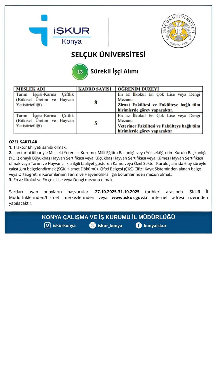 Selçuk Üniversitesi Rektörlüğü, Tarım ve Hayvancılık birimlerinde görevlendirilmek üzere Türkiye İş Kurumu (İŞKUR) aracılığıyla toplam 13 sürekli işçi alımı yapacağını duyurdu.