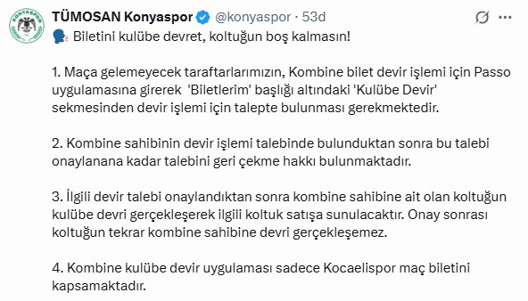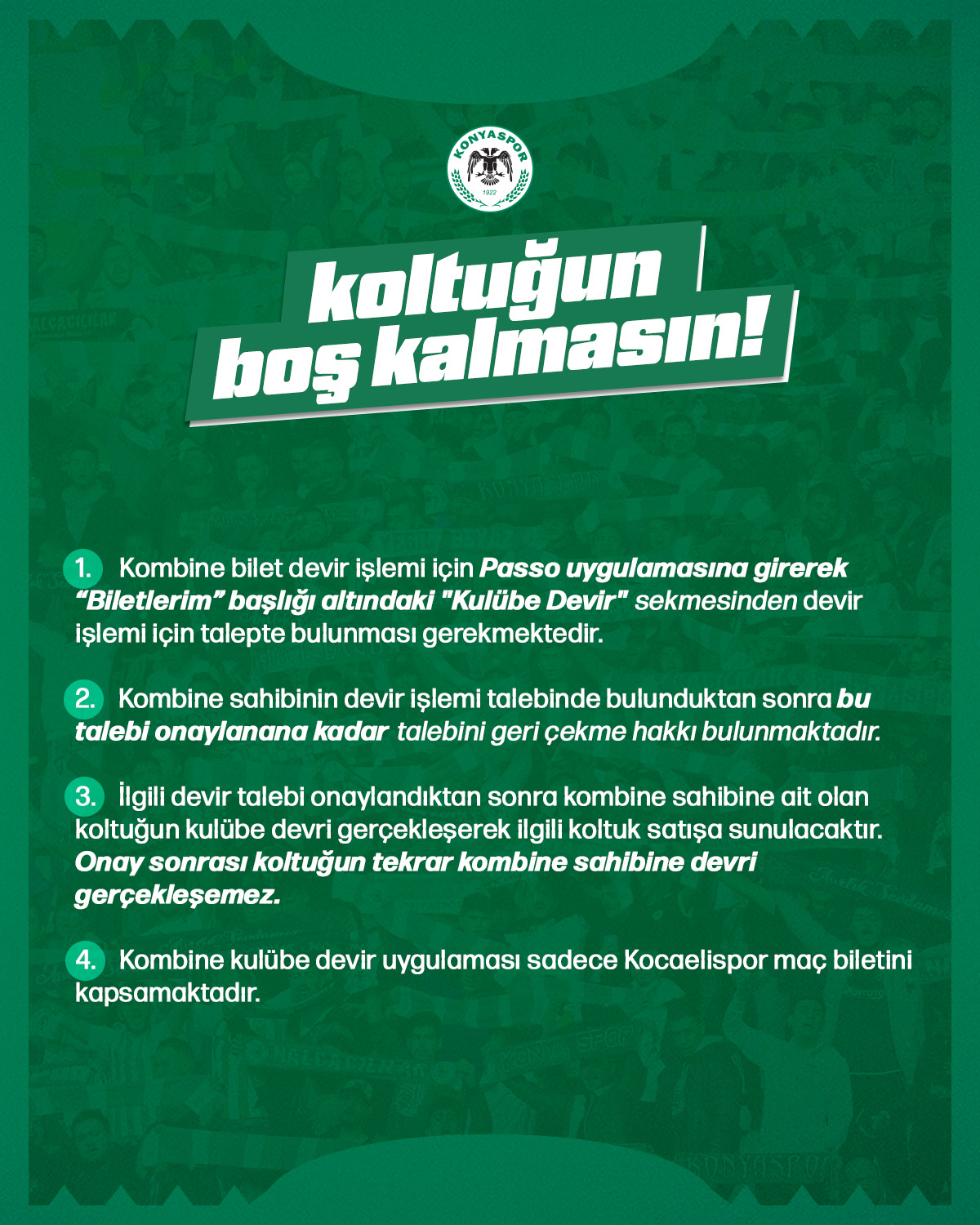 Konyaspor, taraftarların devir talebinde bulunduktan sonra talep onaylanana kadar bu işlemi geri çekme hakkına sahip olduğunu bildirdi. Ancak talep onaylandıktan sonra koltuk kulübe devredilmiş sayılacak ve tekrar kombine sahibine iade edilemeyecek.