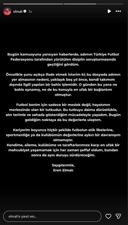 Sosyal medya hesabından yaptığı açıklamada, "Bugün kamuoyuna yansıyan haberlerde, adımın Türkiye Futbol Federasyonu tarafından yürütülen disiplin soruşturmasında geçtiğini gördüm." diyerek sözlerine başlayan Elmalı, şu ifadeleri kullandı:
