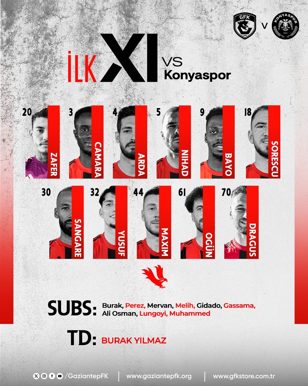 GAZİANTEP FK'NIN İLK 11'LERİ: