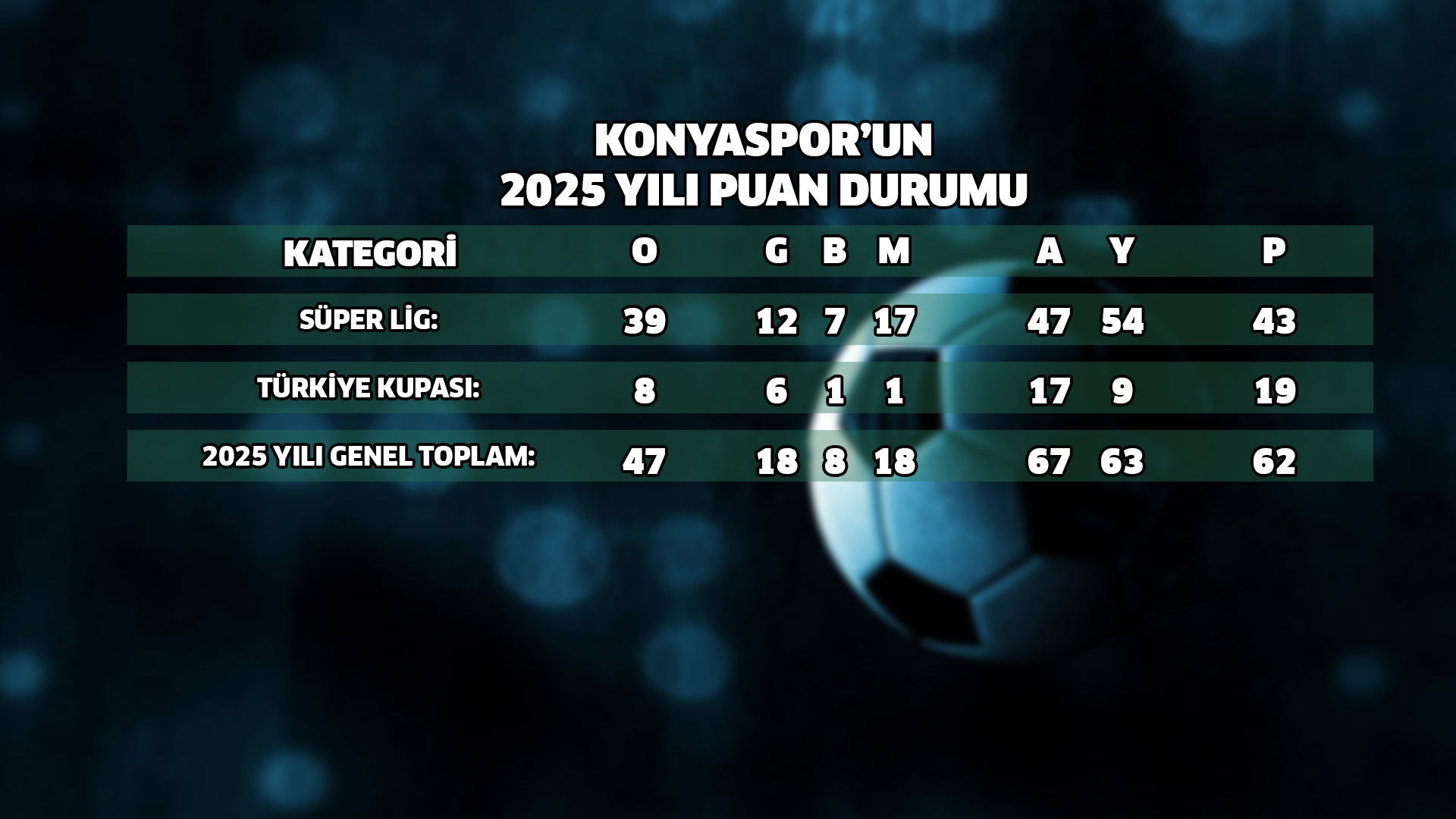 Konyaspor, gerek Süper Lig gerekse Türkiye Kupası olmak üzere 2025 yılında toplam 47 maça çıktı. Yeşil-beyazlılar bu süreçte 18 galibiyet, 8 beraberlik ve 18 mağlubiyet elde etti. Anadolu Kartalı rakiplerine karşı 64 kez gol sevinci yaşarken, ağlarında ise 63 gol gördü. Konyaspor, bu süreçte ise hanesine 62 puan yazdırarak maç başına 0,7 puan topladı.
