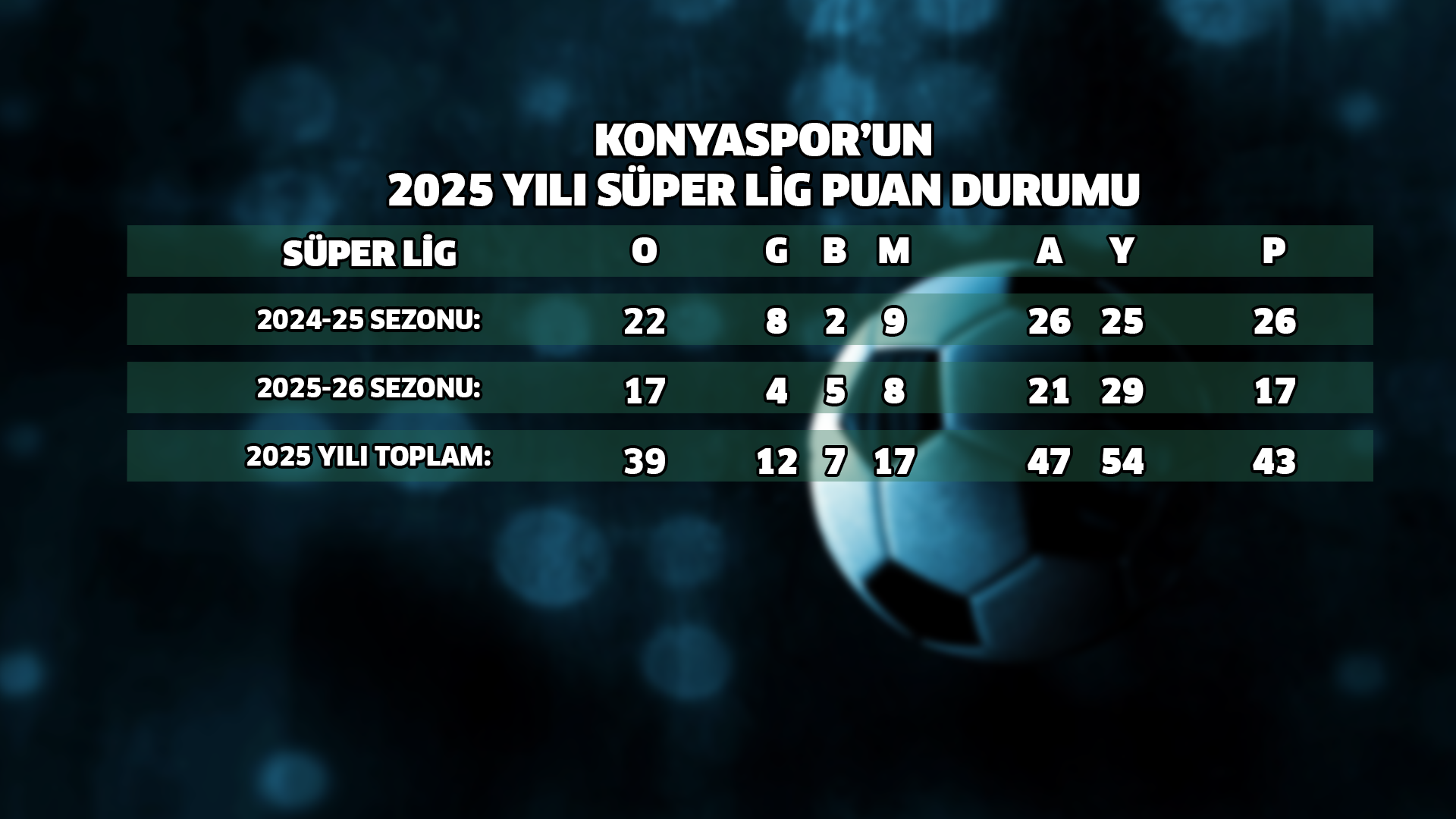 Konyaspor, 2025 yılında Süper Lig'de tam 39 maça çıktı. Yeşil-beyazlılar bahse konu periyottan 12 galibiyet, 7 beraberlik ve 17 mağlubiyet aldı. Rakiplerine karşı 47 kez gol sevinci yaşayan Anadolu Kartalı, filelerinde ise 54 gol gördü. Konyaspor bu süreçte ise hanesine 43 puan yazdırdı.
