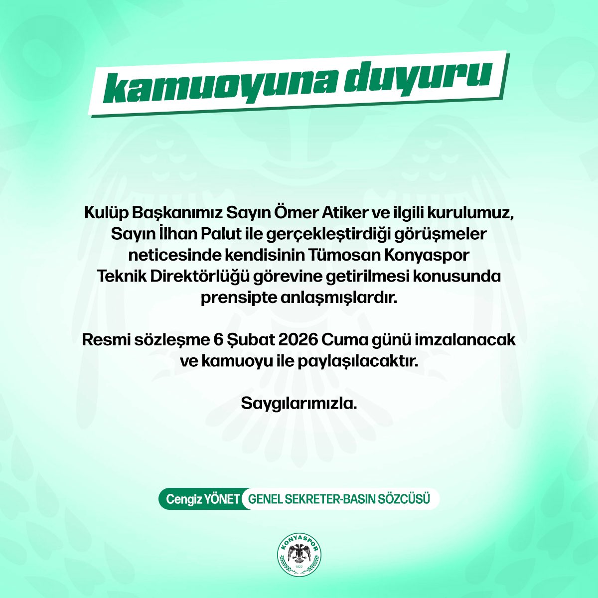 Konyaspor yönetimi tarafından yapılan kamuoyu duyurusunda, İlhan Palut ile yapılacak resmi sözleşmenin 6 Şubat 2026 Cuma günü imzalanacağı belirtildi.