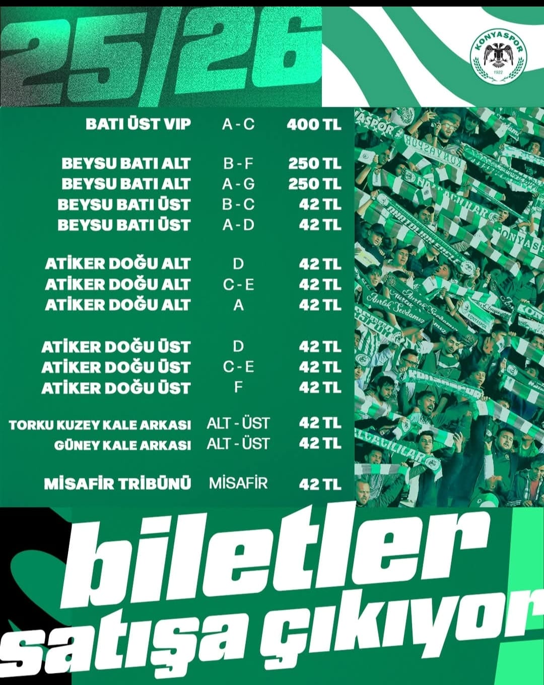 19 Mart Perşembe günü saat 20.00'de MEDAŞ Konya Büyükşehir Stadyumu'nda oynanacak mücadele için taraftarlar biletlerini Passo gişelerinden veya internet üzerinden satın alabilecek.