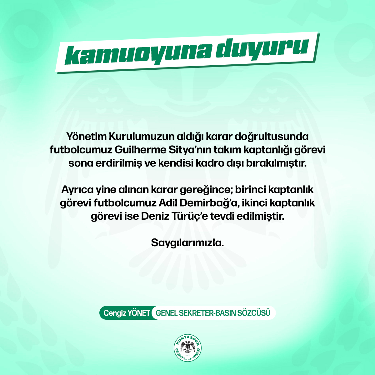 Konyaspor, yaşanan gelişmelerin ardından Sitya'nın kaptanlık görevine son verdiğini resmi olarak açıkladı.