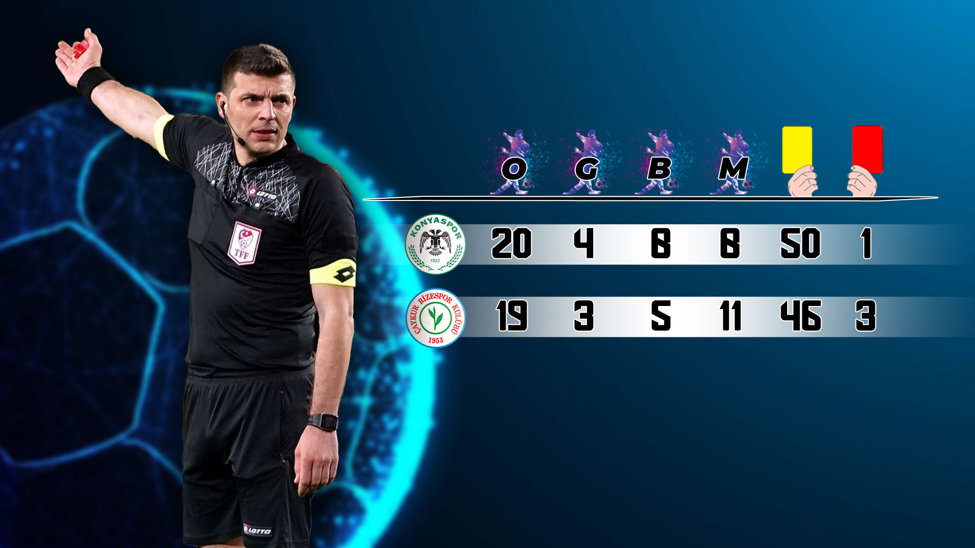 Konyaspor'un rakibi olan Rizespor, Ümit Öztürk ile 21. maçına çıkacak. Yeşil-mavililer Öztürk nezaretinde çıktığı 19 karşılaşmada 3 galibiyet, 5 beraberlik ve 11 mağlubiyet aldı. Karadeniz ekibi Ümit Öztürk'ün elinden 46 kez sarı, 3 kez de kırmızı kartla cezalandırıldı.