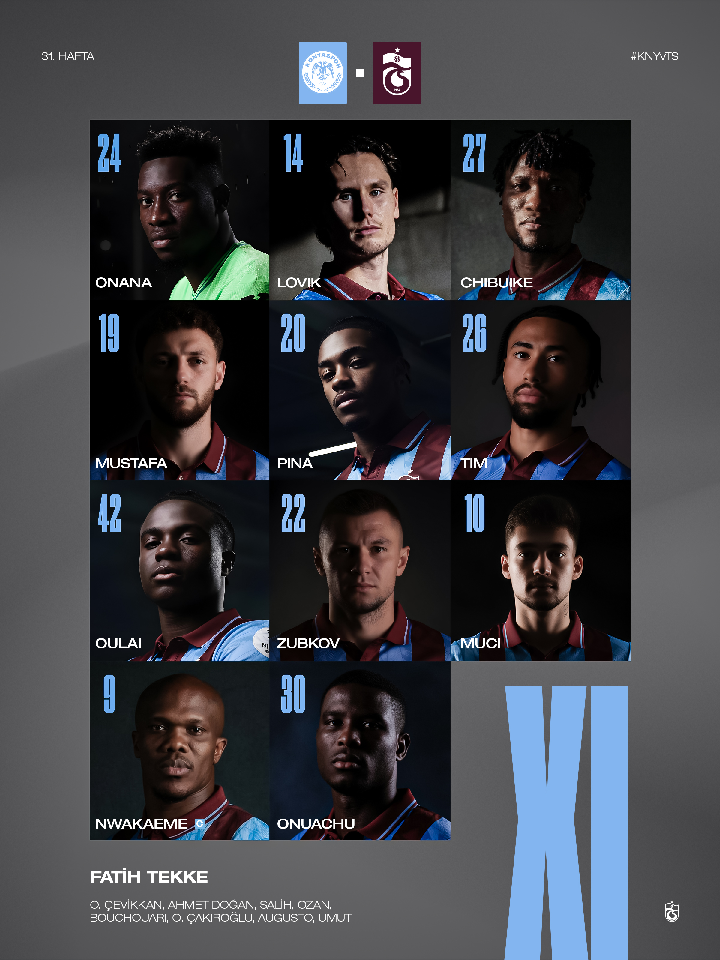 Konyaspor, Süper Lig'in 31. haftasında Trabzonspor'u konuk edecek. Bugün Konya Büyükşehir Stadı'nda oynanacak karşılaşma saat 20.00'da başlayacak. Mücadelenin ilk 11'leri belli oldu.