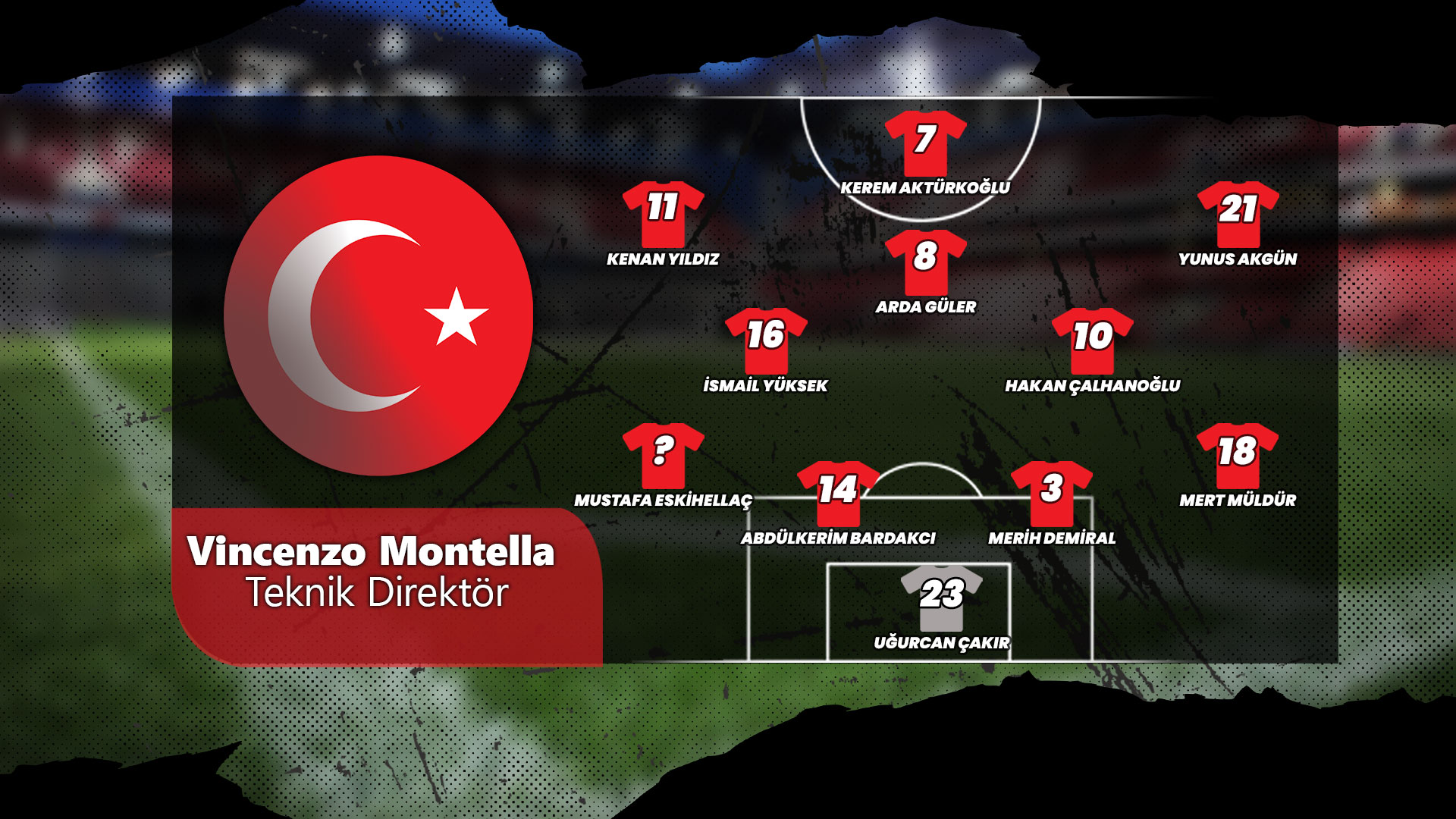 İtalyan teknik adam Vincenzo Montella nezaretinde 4-2-3-1 sistemiyle mücadele eden Türkiye A Milli Futbol Takımımızın, Bulgaristan'a karşı da aynı diziliş ve oyun anlayışıyla sahada yer alması bekleniyor. Ay-yıldızlıların kalesinde Uğurcan Çakır (23), savunma 4'lüsünde Mert Müldür (18), Merih Demiral (3), Abdülkerim Bardakcı (14) ve Mustafa Eskihellaç, 2'li ön liberoda Hakan Çalhanoğlu (10) ve İsmail Yüksek (16), 3'lü orta alanda Yunus Akgün (21), Arda Güler (8) ve Kenan Yıldız (11), ileri uçta ise Kerem Aktürkoğlu'nun (7) forma giymesi bekleniyor.