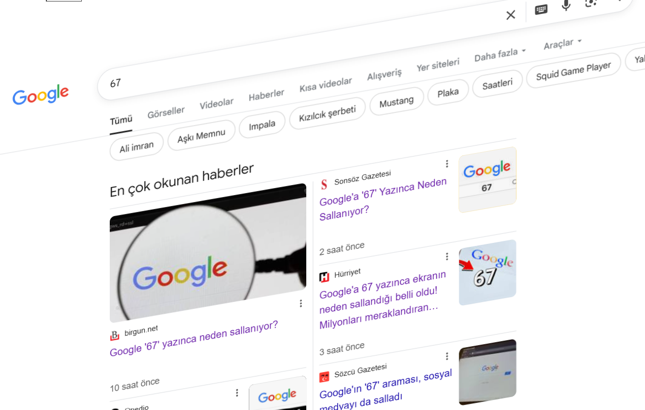 Google'a "67” yazan pek çok kullanıcı, arama sonuçları ekranında kısa süreli bir sallanma efektiyle karşılaşıyor. İlk anda deprem hissi yaratan bu durum, sosyal medyada da hızla yayılırken "Google'a 67 yazınca neden sallanıyor?” sorusunu gündemin üst sıralarına taşıdı. Görüntü ilk bakışta bir hata gibi algılansa da, arkasında oldukça farklı ve bilinçli bir neden bulunuyor.