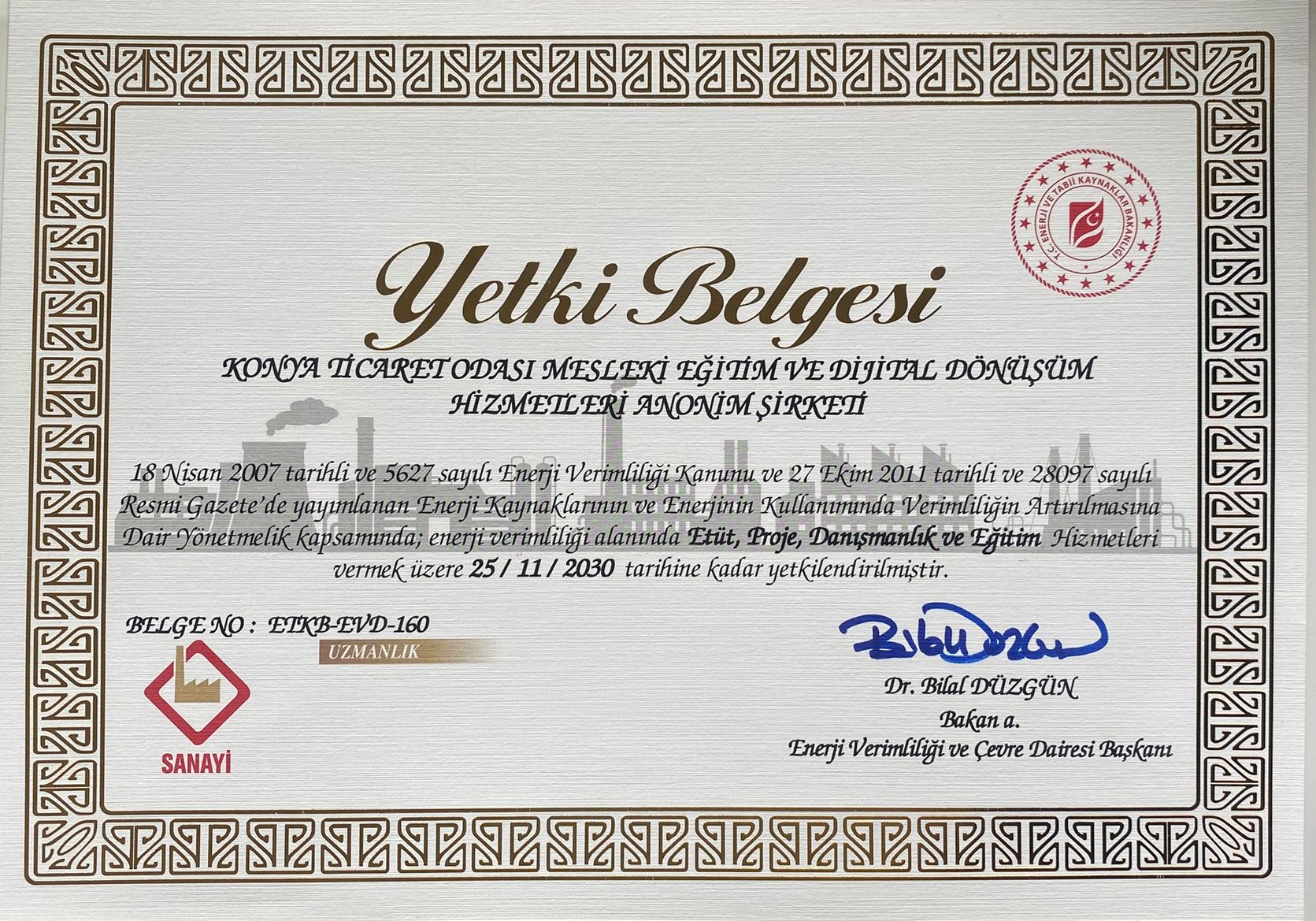 Konya Ticaret Odası Teknoloji ve Eğitim Merkezi (KTOTEK) bünyesinde 2023 yılından itibaren hizmet veren Enerji Verimliliği Merkezi'nin, Enerji ve Tabii Kaynaklar Bakanlığı tarafından verilen Enerji Verimliliği Danışmanlık (EVD) Yetki Belgesi'ni almaya hak kazandığını açıklayan Konya Ticaret Odası Başkanı Selçuk Öztürk, yetkilendirmenin Konya sanayisi açısından önemli bir kazanım olduğunu vurguladı.