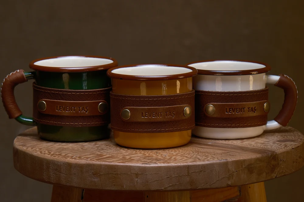 Bizce deri kaplama, emaye kupayı bir mutfak eşyasından çıkarıp kişisel bir objeye dönüştürüyor. Hatta çoğu kişi bu tarz kupaları kullanmaya kıyamayıp masa üstünde dekor olarak bile sergiliyor.